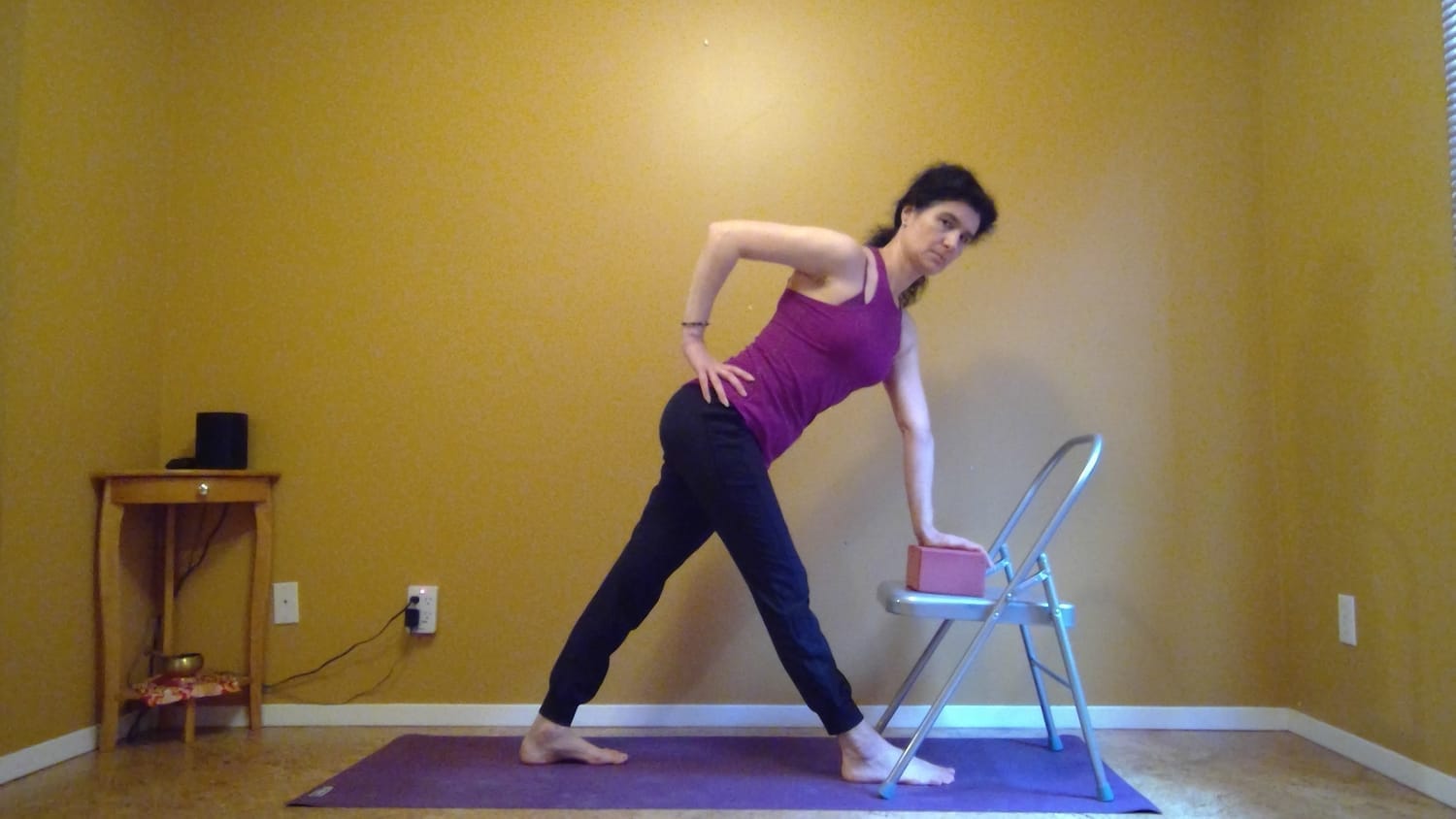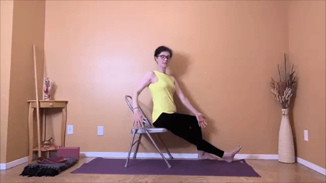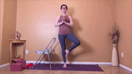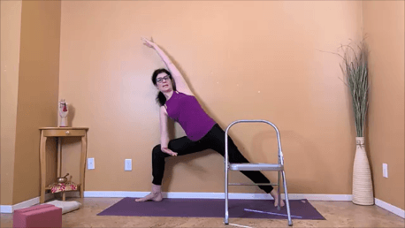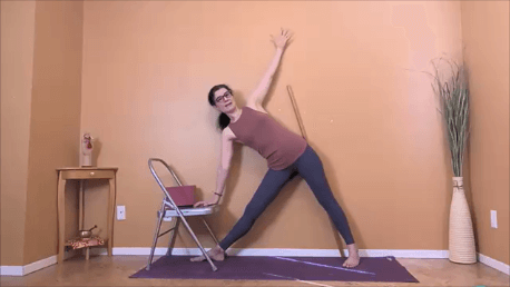 In a yoga for osteoporosis class, you are encouraged to use as many props as you need to make the pose safe. This is different from person to person. Some people are going to need a chair to safely practice Revolved Triangle, other people are going to need both a chair AND a block.